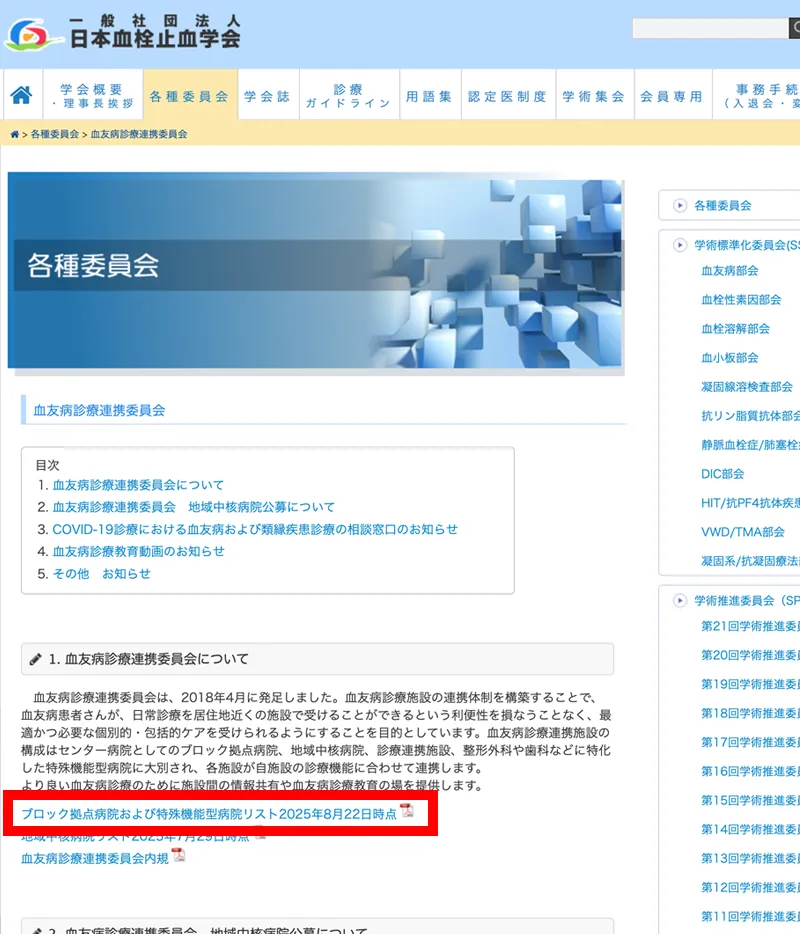 ※ブロック拠点病院リストは、「1. 血友病診療連携委員会について」内にPDFファイルとして配布されています。